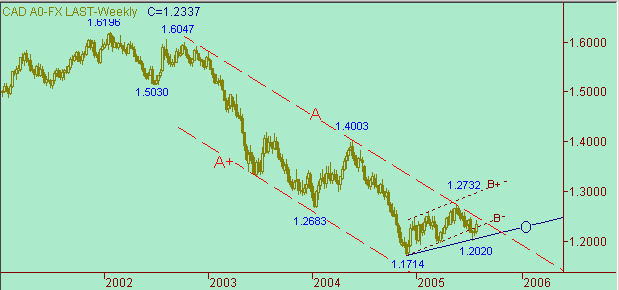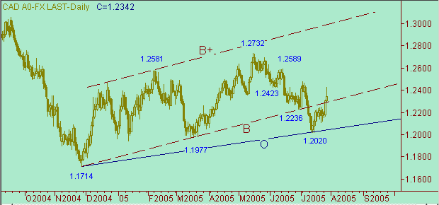 На данный момент рынок сформировал очередную восходящую ветку 1.2110(21/07/05)-1.2425(27/07/05) длиной 315п. Предыдущая up-ветка была немного короче - 1.2021(14/07/05)-1.2246(21/07/05) длина 225п. Сейчас рынок формирует коррекционную формацию от роста 1.2110(21/07/05)-1.2425(27/07/05). Как перспектива - перейти в коррекционную формацию от восходящего движения 1.2020(12/07/05). Технические целевые уровни для коррекционной формации - 1.2280, 1.2155 и 1.2110.