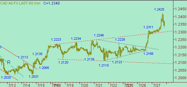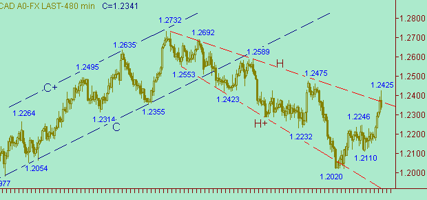 Рынок пытается пробиться выше линии H на рис. 2. Сегодняшний максимум равен 1.2425. Американо/канадец становятся ещё ближе к линии A на рис. 4. Текущее положение линии A на рис. 4 соответствует значению курса 1.2470.