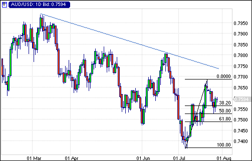 Курс австралийской валюты против американского доллара вчера совершил довольно существенный рост до 0.7600. Пара найдет прочное сопротивление на 0.7635, говорит Роберт Клейтон, технический аналитик из Westpac. Пока этот уровень держится, сохраняется возможность возвращения к 0.7575, а в случае преодоления этой отметки, то к 0.7525, добавляет эксперт. Однако пробитие 0.7635 вызовет волну покупок австралийской валюты и откроет цель на 0.7750/0.7800. ProFinance.Ru - Forex News / Новости Форекс