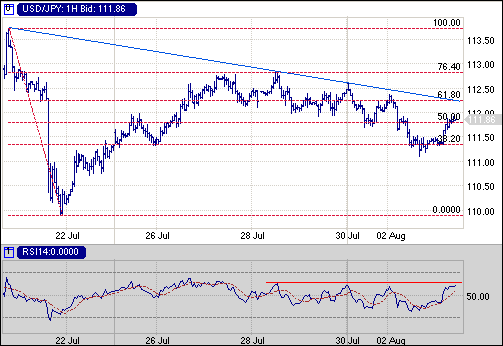 Рассмотрим техническую картину в паре доллар/йена на графике часового временного интервала. После падения до 109.90 с максимумов 20 июля на 113.70, восстановление доллара оказалось ограничено уровнем Фибоначчи 76.4 процента. В настоящий момент ближайшее техническое сопротивление расположено на 112.20/30. Эта область включает в себя значение уровня восстановления Фибоначчи 61.8%, а также текущее значение трендовой линии, построенной с максимумов 20 июля. При этом RSI сохраняет восходящую направленность, сообщая о том, что проверка на прочность указанного сопротивления вполне вероятна, однако пока RSI принимает значения ниже 65.05 (на графике отмечена красная горизонтальная линия), развитие восходящего движения в краткосрочной перспективе остается под сомнением. В текущей ситуации мы считаем целесообразными продажи на подходе к 112.20 с размещением защитного приказа выше уровня восстановления Фибоначчи 76.40 процента. Цели можно отметить на 110.50/60. Михаил Шульгин ProFinance.Ru - Forex News / Новости Форекс