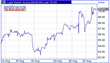 Цены на нефть во вторник доходили до нового рекордного уровня - $70.85 за баррель. Нефть с поставкой в октябре выросла утром в среду на 76 центов или на 1.1%, до $70.57 за баррель. Во вторник контракты подорожали на 3.9% - до $69.81. Фьючерсы на бензин подорожали в США в среду до рекордной отметки из-за остановки НПЗ на юге страны. Рост во вторник составил 20% - до $2.4745 за галлон. Цены фьючерсов на бензин в среду утром в ходе торгов в электронной системе Нью-йоркской товарной биржи выросли до рекордных $2.54 за галлон. Ураган "Катрина" привел к снижению на 95% производства нефти в заливе. Восемь НПЗ в Луизиане и Миссисипи остаются без электроснабжения, и пока не ясно, когда они смогут возобновить работу.