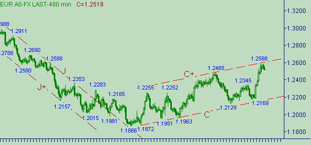Возможной рабочей моделью для постановки позиции является та самая коррекционная формация от роста курса вдоль линии K на рис. 3. Что мы имеем сейчас: курс отошел от верхней границе (значение 1.2610) коррекции на 80п.; время для формирования коррекции уже превысило половину от потенциальной жизни самой коррекции. Вывод - не лезь в эту рабочую модель со своими позициями, могут быть неприятности.