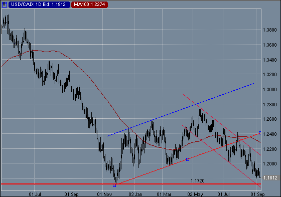 Драйвер для движняка - надвигающийся риск обвала пирамиды нефтяных фьючерсов, а так же "голландская болезнь", которая неминуемо начнет проявлятся в относительно небольшом промежутке времени (до конца года). Как только будущее цен на нефть зависнет на волоске (нарисуется правое плечо), затихнут эмоции по поводу "Катрины", канадец полетит к указанным среднесрочным целям.