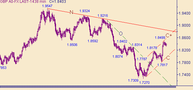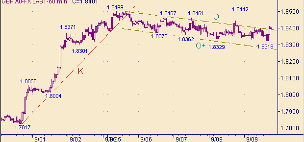 Никаких приметных изменений не наблюдаем на графиках. Курс изменяется так, что определить дальнейшее намерения его будет очень сложно. На рис. 3 видим, что вроде фунт/доллар пытались обозначить выход через верхнюю линию канала O-O+. Но сделали это очень робко. После чего сформировали новый минимум, равный 1.8318, который был ниже минимума в самом канале O-O+ на рис. 3. Не сказать, что наши ожидания продолжения восходящего движения не оправдались, но и не подтверждаются. Ранее мы писали, что восходящее движение в канале C-C+ на рис. 2 выглядит вполне полноценным и у пары фунт/доллар остается технический шанс для продолжения Up-движения в расширении последнего восходящего движения в этом канале, а именно движения с началом от 1.7817(31/08/05). С технической точки зрения для продолжения восхождения есть все предпосылки - курс почти протестировал область 1.8300 и при этом уложился в отведенный нами временной интервал.