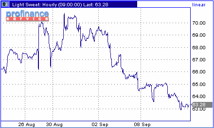 Нефть продолжает дешеветь в ожидании того, что поставки сырья из Европы покроют дефицит, возникший из-за урагана в США. В настоящее время котировки находятся в районе 3-недельного минимума. Международное энергетическое агентство (IEA) приняло решение выделить из стратегических запасов стран-членов 60 млн. баррелей нефти с тем, чтобы оказать помощь США. Этот объем топлива будет поставлен в течение месяца. Стоимость фьючерсов на октябрь на нефть WTI на NYMEX 12 сентября упала на $0.74 - до $63.34 за баррель. Сегодня утром на электронных торгах нефть находится в районе $63.25 за баррель.