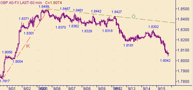 По нашему разумения фунт/доллар так же заняты увлекательным занятием - тестированием линии C на рис. 2, а так же поиском локального дна, завершающего нисходящие движения. Текущее положение линии C на рис. 2 соответствует значению курса 1.8036, а сегодняшний минимум равен 1.8042. А на уровне 1.8056 мы имели равенство длин последних двух нисходящих движений: первое - 1.8427(12/09/05)-1.8181(13/09/05); второе началось от 1.8302(14/09/05). Другие целевые уровни для нисходящего движения: 1.8030, 1.7960, 1.7910.
