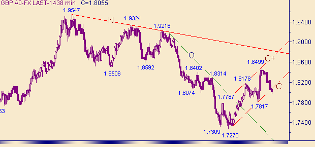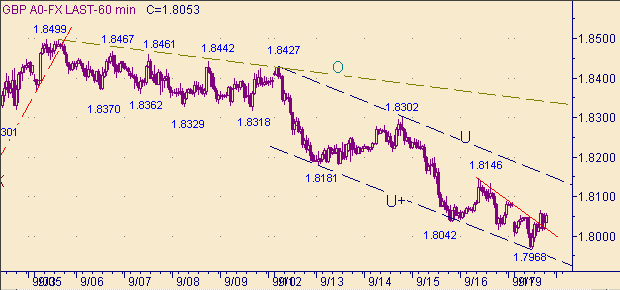 Нисходящее движение в рамках канала U-U+ на рис. 3 продолжается. В рамках этого канала имеем третью нисходящую ветку 1.8146(16/09/05)-1.7968(19/09/05), которую можно посчитать как часть самого канала U-U+ так и как составную часть второй нисходящей ветки с началом 1.8302(14/09/05). Текущая ситуации более всего подходит под понятие формирование коррекционной формации от снижения курса . 1.8146(16/09/05)-1.7968(19/09/05). В случае выхода выше 1.8146 коррекционная формация перейдет в разряд коррекции от снижения курса с началом от 1.8302(14/09/05). Целевые области для коррекционной формации: 1.8070(начало гэпа), 1.8170.