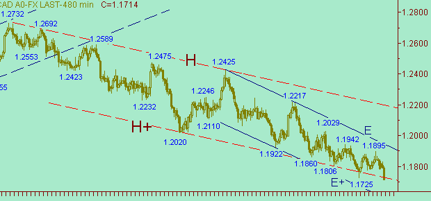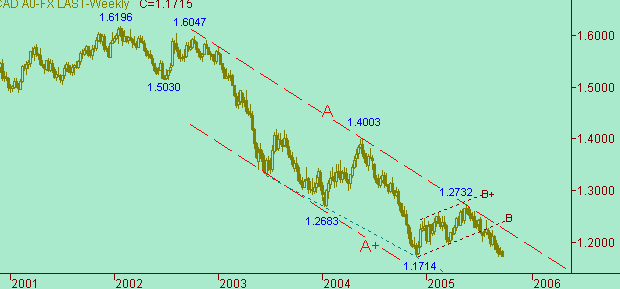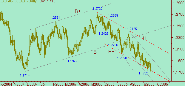 Очередная попытка протестировать область вблизи 1.1700. Напомним, что на уровне 1.1714 закончилась последняя нисходящая ветка в канале A-A+ на рис. 4. Для перспектив новой нисходящей ветки в этом канале необходимо курса закрепится ниже уровня 1.1700. А пока курса остается выше 1.1700 наиболее симпатичная модель изменения курса - формирование коррекции от второй нисходящей ветки (1.2217(1808/05)-1.1725(9/09/05)) в канале E-E+ на рис. 2.
