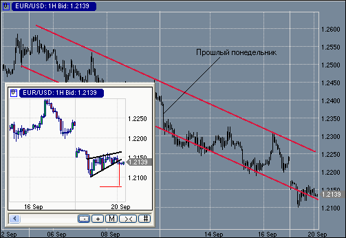 Курс пары евро/доллар, подобно началу прошлой недели, в понедельник начал торговлю резким снижением. При этом также была предпринята попытка преодоления нижней линии медвежьего канала, который мы можем наблюдать на графике часового временного интервала. Стоит отметить, что в своих комментариях от 15 сентября 2005 года мы предупреждали о том, что в преддверии заседания FOMC доллар будет предпринимать агрессивные попытки роста, используя для этого любые рыночные драйверы. Наши ожидания оправдались и указанные цели были достигнуты. Теперь на графике часового периода в паре евро/доллар мы наблюдаем сформированный вымпел, который сохраняет потенциальные перспективы нисходящего движения. До самого факта объявления решения по ставкам и публикации валютной инструкции многие участники рынка будут сдержаны в своих торговых решениях, однако техническая картина предполагает тестирование поддержки на уровне 1.2180 еще до 22:00 мск. Михаил Шульгин