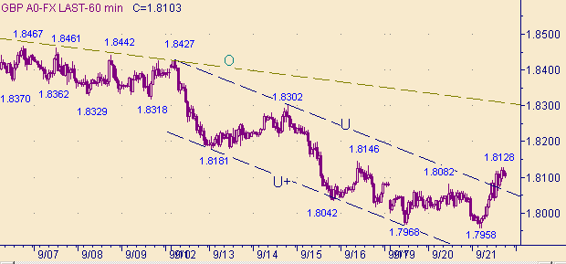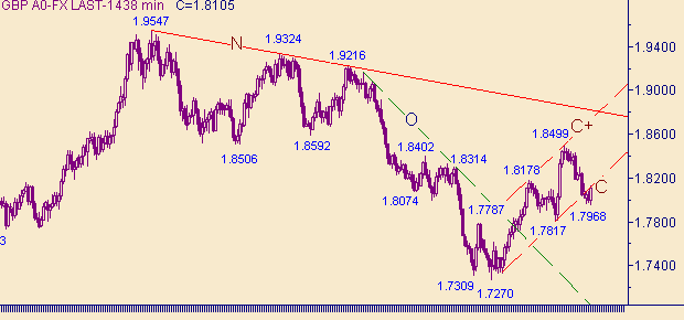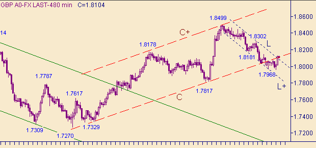 Фунт/доллар пытаются сформировать коррекцию от снижения курса в нисходящем канале L-L+ на рис. 2. Целевые уровни для этой коррекции - 1.8145, 1.8180, 1.8300. Сейчас рынок пытается протестировать снизу линию C на рис. 2. Текущее положение этой линии - 1.8114.