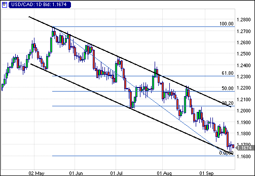 Аналитики в Торонто полагают, что эти цифры вряд ли смогут изменить ожидания повышения ставок 18 октября, считая, что канадская валюта будет торговаться в ближайшем времени в диапазоне с давлением на нижнюю сторону в паре против доллара США. Технические эксперты отмечают важный уровень поддержку на 1.1630. Дон Миколич, исполнительный директор валютной торговли из CIBC World Markets, ожидает, что к концу текущего года курс пары доллар/канада достигнет уровня 1.13000. Наша точка зрения в вопросе целей не изменилась. Ожидая тестирования 1.1600 мы видим канадский доллар в краткосрочной перспективе перекупленным, не исключая коррекционного движения вплоть до верхней границы установленного нисходящего канала на графике дневного интервала, что будет соответствовать в грубом приближении значению коррекционного уровня Фибоначчи 38.2%, построенного от майских максимумов. Михаил Шульгин ProFinance.Ru - Forex News / Новости Форекс