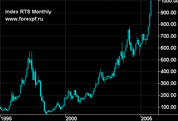 Российский фондовый рынок занес сегодняшний день в историю, покорив планку в 1000 пунктов по индексу РТС, благодаря росту всех ликвидных бумаг, в основном, на западной покупке. Новый исторический максимум составляет 1000.49 пункта. С начала года индекс РТС вырос более чем на 64.5%, причем большая часть этого прироста - порядка 50% - пришлась на летние месяцы и сентябрь. Для достижения индикатором вершины 1000 пунктов российскому фондовому рынку понадобилось 10 лет и один месяц (индекс рассчитывается с 1 сентября 1995 года, начальное значение было принято за 100 пунктов). Общий оптимизм спекулянтов в среду, в частности, был подогрет заявлением главы Федеральной службы по финансовым рынкам Олега Вьюгина о том, что российский фондовый на текущий момент вряд ли можно назвать перегретым, которое было сделано на ежегодной московской инвестиционной конференции, организованной международной финансовой группой Brunswick UBS. После достижения тысячного рубежа произошла мгновенная коррекция индекса на 4 пункта. Однако, по всем признаком, останавливаться на достигнутом рынок пока не намерен. Ралли продолжается вот уже 4 месяца. Сейчас ситуация напоминает евро в декабре 2004 г.: рынок растет абсолютно по инерции, в основном технически - благодаря выкупу шортов, хотя есть и те, кто только сейчас входит в рынок, ставя глобальные долгосрочные цели. К таковым, например, можно отнести CSFB с их рекомендацией покупать русские акции, несмотря на активный рост в последнее время, поскольку они остаются недооцененными. Мы ожидаем формирование вершины в октябре-ноябре. Разворот стоит ждать тогда, когда число леверидж-лонгов станет настолько чрезмерным, что спрос, в том числе, долгосрочный не сможет справится с коррекцией, как это было ранее, и та перерастет в самый настоящий обвал. Дмитрий Полин