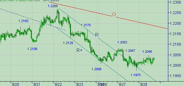 Небольшой проблемой является определение текущей ситуации. Если предполагать, что сейчас формируется коррекционная формация от снижения курса в нисходящем канале R-R+ на рис. 3, то по нашему представлению эта коррекция уже должна подходить к своему логическому окончанию. В этом случае евро/доллару предстоит сделать свой выбор между двумя вариантами дальнейшего изменения курса: первый - формировать коррекционную формацию от снижения курса вдоль линии O на рис. 2; второй - продолжить нисходящее движения с началом от 1.2268(22/09/05), тем самым продолжая и само нисходящее движения вдоль линии O с началом от 1.2588(2/09/05). Если предполагать, что down-движение обозначенное каналом R-R+ на рис. 3 закончилось, то целевой уровень 1.1950 можем опустить и рассматривать следующий список ожидаемых целей: 1.1895-1.1905, 1.1765. Далее будем дополнять этот список.