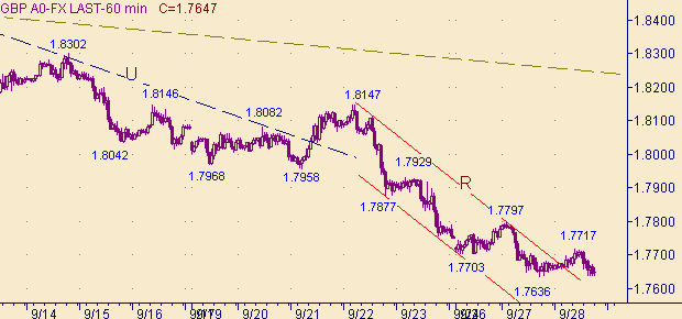 Фунт/доллар остаются выше уровня 1.7635, обозначая, что они пытаются таки сформировать коррекцию от снижения курса в канале R-R+ на рис. 3. Что бы обозначить свое намерение down-движения, рынку необходимо выйти ниже 1.7600. На уровне 1.7606 имеем равенство длин нисходящей ветки 1.8499(5/09/05)-1.7958(21/09/05) и ветки с началом от 1.8147(22/09/05). Да и на рис, 2 видим, что первое восходящее движение закончилось на уровне 1.7617. Далее рынку предстоит решить задачу очень похожую на задачу стоящую перед парой евро/доллар, а именно: или корректироваться от снижения в канале R-R+ на рис. 3 с перспективой перехода в коррекцию от всего нисходящего движения с началом от 1.8499(5/09/05) или пытаться пробиваться вниз по графику. Для случая коррекционного сценария технические целевые уровни: 1.7735, 1.7800, 1.7930, 1.7950, 1.8145. Для случая продолжения нисходящего сценария технические целевые уровни: 1.7605, 1.7505, 1.7400, 1.7260, 1.7070.