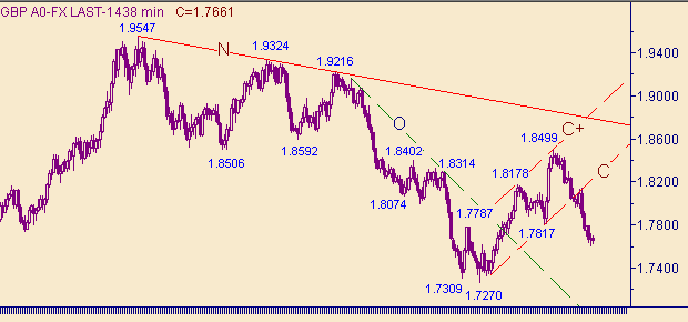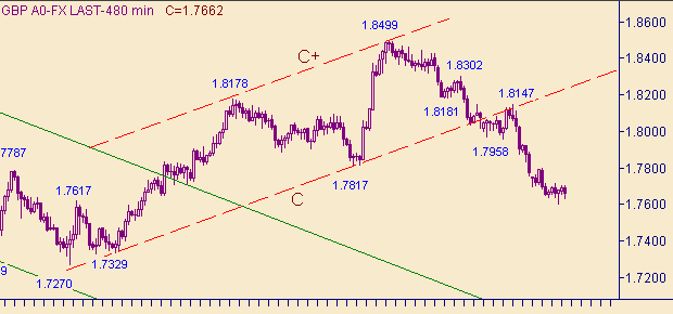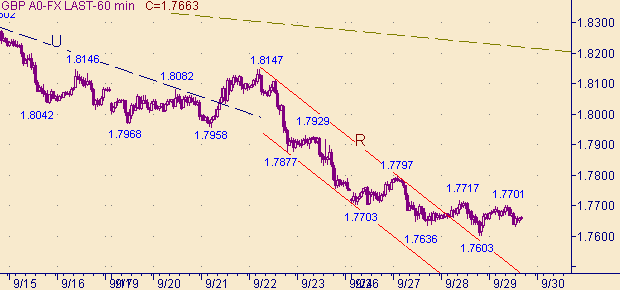 Фунт/доллар остаются в своем репертуаре - очевидные понижения как донышек так и вершинок. Пробуем рассматривать коррекционную формацию от снижения курса в канале R-R+ на рис. 3, так и даже в ней курс умудрился снизиться до 1.7603. По структуре последнее нисходящее движение курса (1.7717(28/09/05)-1.7603(28/09/05)) более похоже не на составную часть коррекции, а на продолжение нисходящего движения, обозначенного каналом R-R+ на рис. 3.