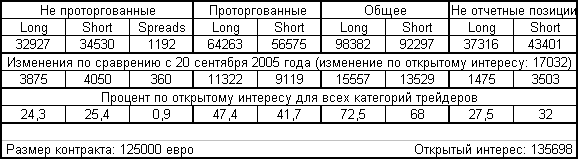 Представляем Вам сводную таблицу итоговых данных CFTC торговли фьючерсами Euro FX на Чикагской Товарной Бирже по состоянию на 27 сентября 2005 года.