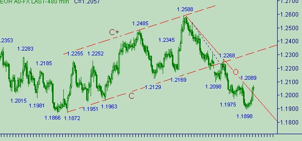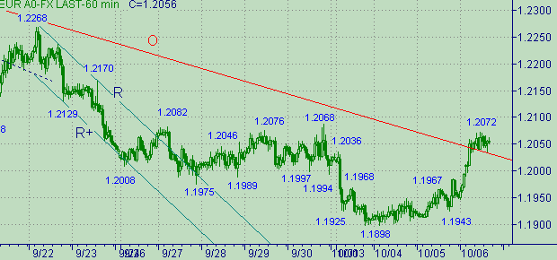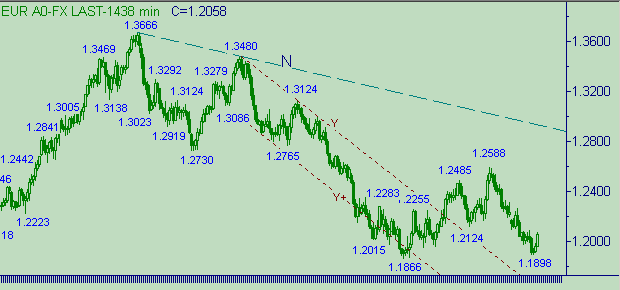 Наблюдаем упорное тестирование области вблизи уровня 1.2070. В рамках этого тестирования евро/доллар вышли выше линии O на рис. 2. Отметим, что для участников рынка остается важным уровень 1.2089, как уровень соответствующий последней линию-образующей вершинки. Т.к. по классическому определению нисходящего тренда можем утверждать, что он уже закончился (для тренда вдоль линии O на рис. 2) только в случае выхода курса выше 1.2089. А пока курс остается выше этого значения цены можем ожидать формирования очередной нисходящей веточки.