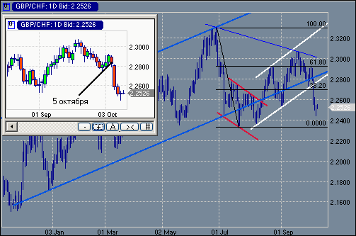 В своих технических комментариях относительно перспектив кросс курса фунт/франк от 5 октября 2005 года мы недвусмысленно заявили о том, что формируем медвежьи настроения в данной паре, рекомендовав активацию коротких позиций. Как мы могли наблюдать в дальнейшем, в течение четырех последующих дней, считая с 5 октября, пара реализовала значительное нисходящее движение, протестировав минимумы в области 2.2445. Если обратиться к графику дневного временного интервала, то непреодолимым препятствием на пути восходящего движения 5 октября стал уровень восстановления Фибоначчи 61.8%, построенный от июльских минимумов. В последствии цены покинули долгосрочный восходящий канал (синие линии), что теперь уже четко сигнализирует о сломленной многолетней тенденции, а также пробили нижнюю белую линию восходящего среднесрочного канала и опустились ниже минимумов 1 сентября на 2.2530. Мы не придаем большого внимания сформированному 10 октября доджу, поскольку свечной анализ в данном кроссе является плохим сигнальщиком в плане анализа дальнейших ценовых тенденций. Мы сохраняем пессимистичные настроения в данной паре. В среднесрочной перспективе мы ранее указывали цель на 2.2300. Торговую цель мы теперь размещаем на уровне 2.2400. Михаил Шульгин ProFinance.Ru - Forex News / Новости Форекс
