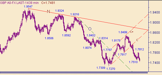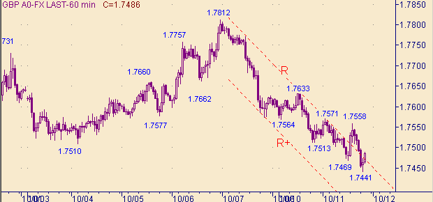 Ближайшая задача, которую предстоит решать паре фунт/доллар - выбор между моделью формирования коррекции от снижения с началом от 1.7812(6/10/05) и моделью продолжения этого самого нисходящего движения. Для продолжения движения необходимо обозначить технический сигнал в виде закрытия, например свечи с периодом 240 мин., ниже уровня 1.7385. Согласны, что размазанность области поддержки до 35-50п. ничего хорошего не привносит. Приходится судить о достижении области по верхней границы, а выход курса, как сигнал продолжения нисходящего движения, определять по нижней.