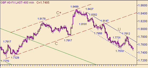 Уровень 1.7500 успешно пройден. Теперь фунт/доллар приближаются к следующей важной технической области - интервал 1.7385-1.7420. Этот интервал можно расширить верхней границей - 1.7435 (уровень, когда длина нисходящего движения с началом от 1.7812(6/10/05) составляет 38.2% от длины нисходящего движения 1.8499(5/09/05)-1.7510(4/10/05)). Сегодняшний минимум равен 1.7441.