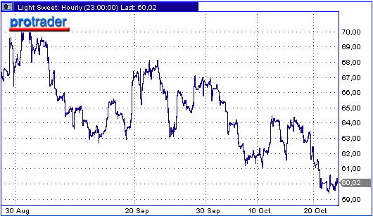 Цены на нефть продолжают плавное снижение на фоне уменьшения опасений по поводу вреда, который мог причинить ураган "Вилма" нефтедобывающим мощностям в Мексиканском заливе. Как и прогнозировалось, ураган не затронул в минувшие выходные буровые установки и платформы, обойдя их стороной. Стоимость нефтяных фьючерсов с поставкой в декабре на NYMEX по итогам торгов 24 октября составила $60.32 за баррель (-$0.31). Сегодня утром на электронных торгах нефть находится в районе $60.20 за баррель.