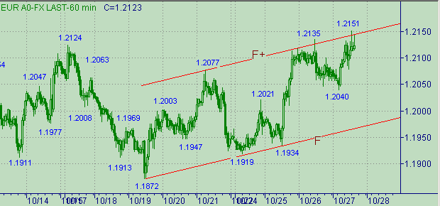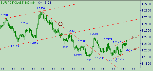 Идея торгового плана - пытаемся использовать модель продолжения восхождения в канале F-F+ на рис. 2. При этом обязательный параметр плана - стоп-лосс располагать ниже 1.2079. Далее можно на свой вкус и цвет. К примеру на наш вкус: в случае снижения курса до уровня 1.2110 открываем позицию на покупку, стоп-лосс - 1.2073, цель - 1.2220, промежуточная цель для переноса стоп-лосса - 1.2170.