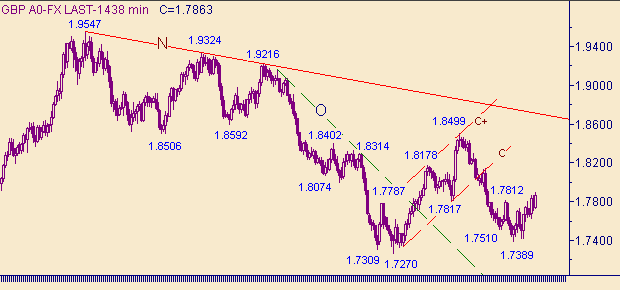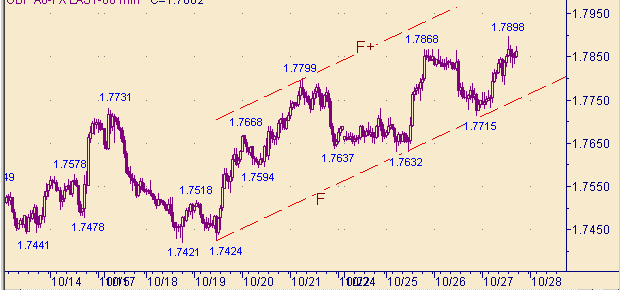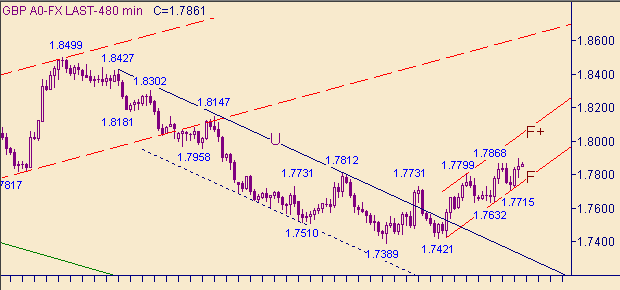Рассмотрение восходящего канала F-F+ на рис. 2 и 3 не принес нам удовлетворения, т.к. имеет структуру изменения цены такую, что можно рассматривать варианты как на продолжение up-движения так и на формирование коррекции в случае окончания роста курса в канале. Критерий, подтверждающий вариант продолжения восходящего движения - выход курса выше 1.7900. Критерий, подтверждающий модель коррекции - выход курса ниже 1.7715.