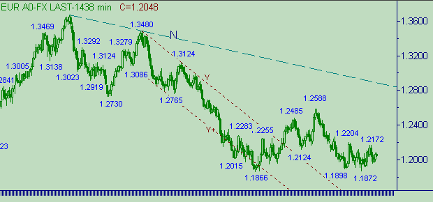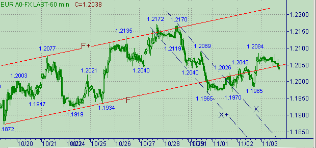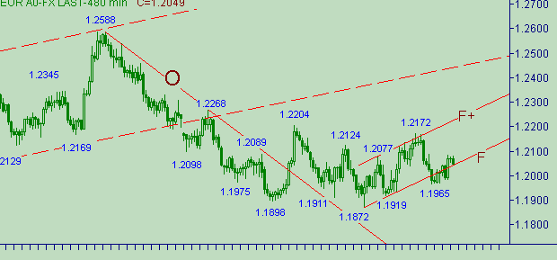Задерживаемся вблизи уровня 1.2080 - вчерашний максимум равен 1.2084. Сейчас формируется коррекция от роста курса 1.1985-1.2084 (см. на рис. 3), которая является третьей восходящей веткой в up-движении с началом от 1.1965(31/10/05). Для этого up-движения целевые уровни на текущий момент: 1.2090, 1.2125, 1.2170, 1.2220. Отметим, что этот рост курса выходит за рамки модели формирования коррекционной формации от снижения курса в канале X-X+ на рис. 3. К чему мы вспомнили про это? А к тому, что самое время евро/доллару попытаться что то предпринять - или сформировать очередную dоwn-ветку подобную каналу X-X+, с атакой на ценовой интервал 1.1880-1.1920 и перспективами выхода к 1.1610, или выйти выше уровня 1.2100, показав свой интерес к области вблизи 1.2230 с перспективами на 1.2700.