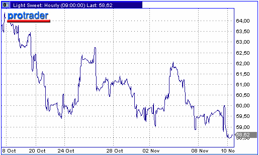 Цены на нефть продолжают падать на фоне роста запасов сырья в США. Согласно еженедельному докладу министерства энергетики, коммерческие запасы нефти в стране с 29 октября по 4 ноября выросли на 1.4%. Суточная добыча нефти в Мексиканском заливе за неделю увеличилась на 235 тыс. баррелей, что составляет 50% уровня производства до ураганов. Стоимость нефтяных фьючерсов с поставкой в декабре на NYMEX 9 ноября снизилась на $0.78 - до $58.93 за баррель. Сегодня утром нефть торгуется в районе $58.60 за баррель.