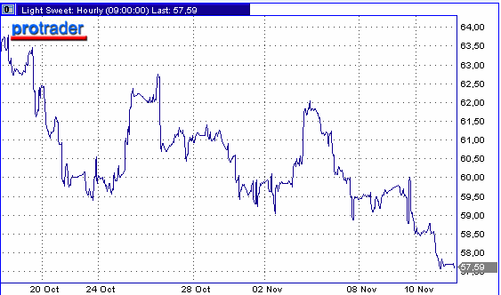 Цены на нефть резко упали в четверг на фоне роста запасов топлива в США и прогнозов теплой погоды в Северной Америке. Цена декабрьских фьючерсов на нефть упала в четверг почти на 2% (на $1.13) - до $57.80 за баррель, что стало минимумом за 4 месяца. По сравнению с рекордным августовским уровнем цены упали уже на 19%. Аналитики прогнозируют сокращение потребления топлива на северо-востоке страны на 7% относительно нормы на неделе с 11 по 17 ноября. Международное энергетическое агентство снизило оценку прироста спроса на углеводородное сырье в текущем году в целом на 70.000 баррелей в сутки - до 1.2 млн. б/с. "Печное топливо не получает положительного толчка от теплой погоды, поэтому мы играем на снижение", - сказал Джим Риттербуш, президент Ritterbusch and Associates.