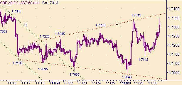 Фунт/доллар пытаются обозначить свое намерение выйти из расходящегося треугольника F-F+ на рис. 3. Последнее восходящее движение составило 297п. - 1.7046(28/11/05)-1.7343(28/11/05). Если предполагать, что от вчерашнего минимума, равного 1.7142(29/11/05), сформируется подобная же движение, то целевая область у него ожидается вблизи 1.7439.
