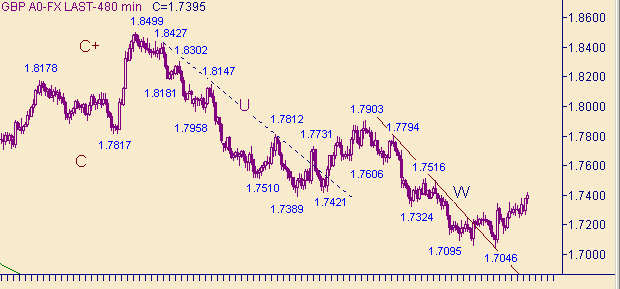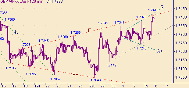 В пределах расходящегося треугольника F-F+ на рис. 3 сформировался другой расходящийся треугольник - S-S+ на рис. 3. Для восходящего движения с началом от 1.7046(28/11/05) ожидали в качестве целевой области достижение уровня 1.7435. Можем ожидать формирования одного из up-сигналов: или закрытие дня выше 1.7350 или закрытие часа выше 1.7440. В случае выхода выше 1.7225 следующей целевой областью рассматриваем достижение интервала 1.7500-1.7520. Текущее положение линии X на рис. 1 соответствует значению курса 1.7500. А следующая важная ступенька уже будет находиться на уровне 1.7600.