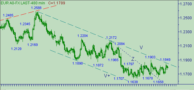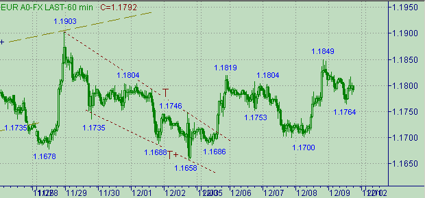 Евро/доллар отдали предпочтение размерности up-тренду более мелкой формации. Рассматривая восходящее движение с началом от 1.1658(2/12/05) мы имеем две восходящие ветки (1.1658(2/12/05)-1.11819(5/12/05) и 1.1700(7/12/05)-1.1849(8/12/05)) с равенством длин этих веток на уровне 1.1861. В свою очередь сама вторая из этих двух веток так же состоит (на текущий момент) из двух восходящих движений (1.1700(7/12/05)-1.1788(12/08/05) и 1.1760(12/08/05)-1.1849(12/08/05)), с равенством длин на уровне 1.1848. В защиту первой пары up-трендов можем сказать, что ещё не вечер и ничего не мешает евро/доллару продолжить свои up-подвиги на графиках.