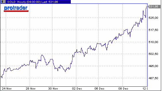 Цены на золото продолжают ралли, которое продолжается уже пятую неделю подряд. Фонды покупают металл, стремясь диверсифицировать портфели и защититься от инфляции. С октября металл подорожал на 14%, с начала года - на 21%. В понедельник золото с немедленной поставкой подорожало на азиатских торгах на 1% ($5.34) - до $531.74, за унцию, что является рекордом с апреля 1981 года. На площадке Comex Нью-йоркской товарной биржи февральские контракты на золото выросли в цене в пятницу на 1.4% ($7.50) - до $530.20, а входе сессии достигали максимальной с 1981 года отметки в $534.30. В 1980 году цены доходили до $873. Спрос на золото растет со стороны ювелиров и инвесторов, обеспокоенных инфляционными рисками, при этом производство золота в последние годы падало.