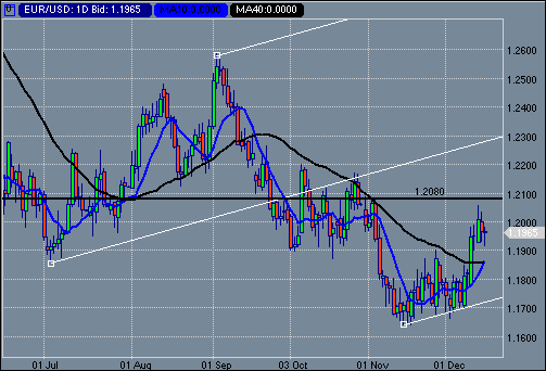 Что же мы получили в итоге? Доллар предпринял попытку роста против евро, но борьба в районе 1.1940 была завершена в пользу европейской валюты, и теперь мы вновь вблизи фигуры 1.2000. Достижения против фунта были менее скромны, но задержаться вблизи уровня 1.7600 доллару также не удалось. Возьмем за индикатив курс пары евро/доллар и рассмотрим техническую картину на графике дневного временного интервала. Среднесрочная тенденция роста доллара будет полностью возвращена в том случае, если курс пары окажется под нижней линией вил Эндрюса, то есть ниже 1.1730. В более краткосрочной перспективе доллару необходимо вернуть уровень 1.1850. В грубом приближении, это текущее значение 10-дневной и 40 дневной скользящих средних. С верхней стороны ключевая отметка находится на 1.2080, представляя собой максимумы ноября. Лишь в случае ее пробития евро получает зеленый свет на 1.2300.