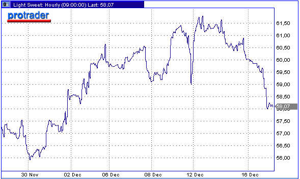 Цены на нефть испытали обвальное падение на пятничных торгах. Нефть дешевеет на фоне роста запасов сырья и падения спроса на топливо в США. За три последних торговых дня снижение котировок составило 5.5%. Погодный фактор остается определяющим на топливном рынке. Синоптики прогнозируют повышение температуры на северо-востоке США на текущей неделе. Похолодание ожидается только в конце месяца. "Снижение продолжилось. Распродаже, помимо сообщенных ранее данных о запасах, добавивших понижательного настроения, способствует прогноз потепления", - сказал Эд Меир, аналитик Man Financial. Стоимость нефтяных фьючерсов с поставкой в январе на NYMEX 16 декабря упала на 3.2% (на $1.93) - до $58.06 за баррель. Сегодня утром нефть торгуется в районе $58.05 за баррель.