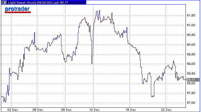 Цены на нефть немного подешевели на торгах в четверг из-за потепления в США. Спрос на топливо на северо-востоке страны на предстоящей неделе, по прогнозам, будет ниже среднего показателя на 16%. По данным министерства энергетики США, на неделе с 10 по 16 декабря запасы нефти выросли на 1.3 млн. баррелей - до 322.5 млн. баррелей. Стоимость нефтяных фьючерсов с поставкой в феврале на NYMEX 22 декабря снизилась на $0.28 - до $58.28 за баррель. Сегодня утром нефть упала на $0.10 по сравнению с итоговой котировкой четверга.