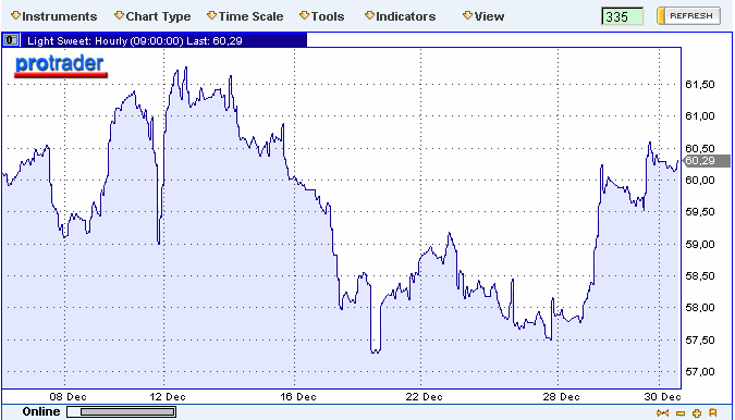 Цены на нефть пытаются закрепиться выше психологического уровня в $ 60 за баррель. Стабильности сырьевого рынка способствуют вышедшие накануне в США данные о неожиданном снижение запасов бензина и дистиллятов на минувшей неделе. Февральские контракты на американскую легкую нефть выросли в цене на 46 центов до $60.28 за баррель после роста на $1.66 в ходе предыдущей сессии. В Лондоне нефть Brent подорожала на 43 цента до $58.07 за баррель. Как сообщило в четверг Управление энергетической информации (EIA), запасы нефти в США выросли за неделю, завершившуюся 23 декабря 2005 года, на 100.000 баррелей до 322.6 миллиона баррелей, тогда как запасы бензина сократились на 1.2 баррелей до 202.9 миллиона баррелей, а запасы дистиллятов снизились на 900.000 баррелей до 126.8 миллиона баррелей. "Рынок начинает обращать внимание на этот невероятный спрос на бензин, который на один процент выше прошлогоднего, - сказал аналитик Alaron Trading Фил Флинн. - У нас серьезные проблемы с бензином, и на это обратят еще больше внимания, когда приблизится автомобильный сезон".