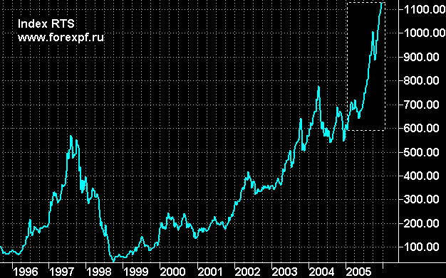 Осмысление инвесторами, как отечественными, так и иностранными, того факта, что высокие цены на нефть - это надолго, что ралли на сырьевом рынке, включая и цены на металлы, явилось следствием не спекулятивной игры, а, в первую очередь, результатом сдвига кривой спроса за счет роста мировой экономики оказало чрезвычайно положительное влияние на отечественный фондовый рынок. Бурный рост акций российских компаний в 2005 году привел к тому, что индекс РТС закрыл год на уровне 1125.6 пункта, а индекс ММВБ - на уровне 1011.0 пункта, показав тем самым прирост за год на 83%. Ралли началось в самый неожиданный период - летом - и продолжается по настоящее время. Помимо "сырьевого фактора" движущей силой нашего рынка выступили и такие связанные с ним моменты как улучшение ситуации с государственными финансами, рост экономики и внутренних доходов. Все это нашло отражение в повышении России международного кредитного рейтинга, что являлось наряду с либерализацией рынка