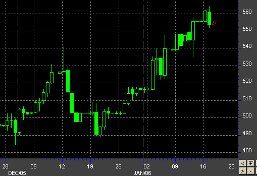 Цены на золото пытаются сегодня подать сильный медвежий сигнал - сформировать свечную модель "медвежье поглощение", хотя здесь и можно найти небольшой недостаток в виде неполного перекрытия тела предыдущей свечи, но мы не придаем этому значения. Закрытие сегодняшнего дня ниже $ 555 за унцию создаст предпосылки коррекции в район $ 540 за унцию.