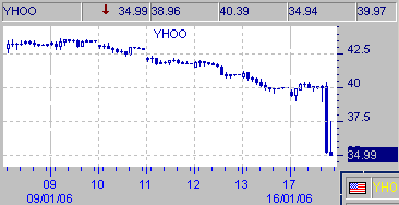 После завершения регулярной торговой сессии на Wall Street компания Yahoo опубликовала свои результаты за 4 квартал, в которых сообщила что заработала 683 млн. долларов или 46 центов на акцию. В тот же самый период времени год назад заработок Yahoo составлял 373 млн. долларов или 25 центов на акцию. За исключением некоторых издержек и опционных расходов, компания заработала 247 млн. долларов или 16 центов на акцию по сравнению с 187 млн. и 13 центами на акцию год назад. Однако результаты не соответствовали ожиданиям, поскольку экономисты рассчитывали на 17 центов на акцию. Доход, за исключением плат дистрибутивным партнерам, вырос на 36 процентов до 1.07 млрд. долларов, что соответствовало ожиданиям. Акции Yahoo на электронных торгах упали на 9 процентов. ProFinance.Ru - Forex News / Новости Форекс