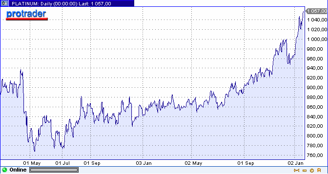 Стоимость платины в среду достигла исторического пика в $1.056/1.060 за унцию против $1.047/1.051 в Нью-Йорке также благодаря скупке фондами. Как ожидается, поставки платины из Южной Африки, крупнейшем добытчике платины, будут расти, однако рост национальной валюты и операционных расходов соответственно могут поставить под угрозу реализацию новых проектов, говорят аналитики.