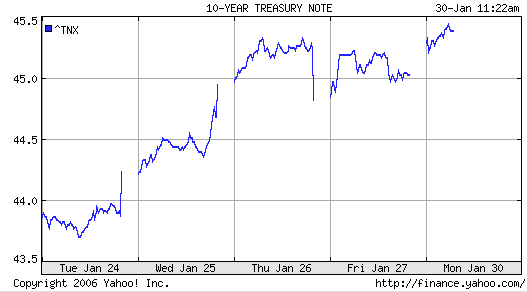 Распродажа американских государственных облигаций продолжается, а их доходность, соответственно, достигает все новых высот. Так, доходность десятилетних бондов Казначейства США после открытия торгов в понедельник выросла до семинедельного максимума, что аналитики связывают с ожиданиями дальнейшего повышения ставки рефинансирования ФРС, о чем последняя даст намек, возможно, уже завтра. Опубликованные в пятницу инфляционные показатели, а также сегодняшние данные усилили подобные настроения. Потребительские расходов в США взлетели в декабре на 0.9% при прогнозах роста на 0.7%. "После каждого статотчета впору вставать в "шорт", - говорит Дэвид Эйдер из RBS Greenwich Capital. Во вторник ФРС, как ожидается, повысит ставку по федеральным фондам (в четырнадцатый раз подряд) на 25 пунктов до 4.5% годовых. Завтра же Алан Гринспен проводит свое последнее заседание, а на его место заступает Бен Бернанке. Помимо ставок эта неделя насыщена другими важными отчетами, которые окажут воздействие на рынок облигаций. Основной из них выйдет в пятницу - отчет о состоянии рынка труда. Кроме того, Казначейство сообщит о сумме аукционов в первом квартале.