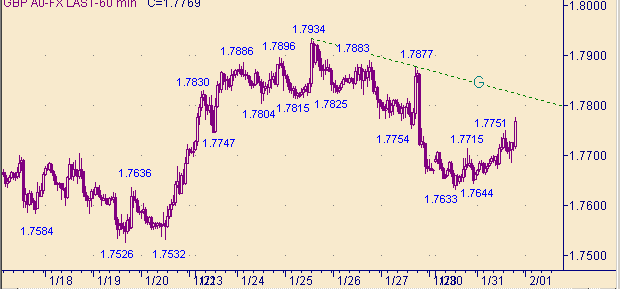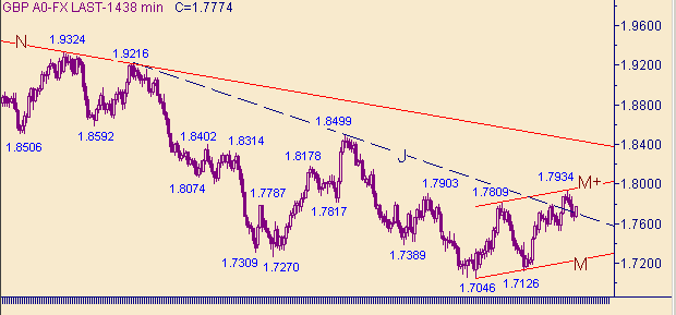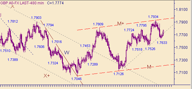 Фунт/доллар в восходящем порыве пытаются выйти выше 1.7750. Вспоминаем, что на уровне 1.7754 закончилась первая нисходящая ветка в down-движении вдоль линии G на рис. 3. Текущее положение линии g на рис. 3 соответствует значению цены 1.7824. Следующие технические целевые области: 1.7790, 1.7870, 1.8010.