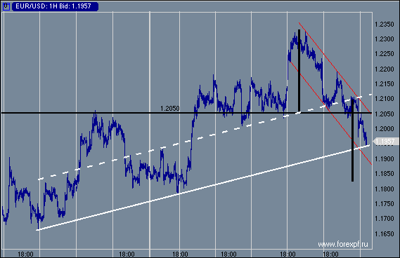 Рассмотрим техническую картину в паре евро/доллар на примере графика часового временного интервала. Цены в рамках краткосрочного медвежьего канала (красные линии) в недавнем времени пробили область ключевой поддержки на 1.2050. Потом протестировали этот уровень в качестве сопротивления снизу вверх и только потом продолжили развивать нижнюю сторону. Сам по себе, это позитивный знак для продолжения укрепления американской валюты. Это предположение подкрепляется уже пробитой пунктирной линией. Наше представление заключается в том, что конструкция, образованная графиком данной пары с 4 февраля и по сей день, по смыслу отражает сущность такой фигуры классического анализа, как "голова и плечи" (классической модели этой фигуры наблюдаемая картина, конечно, не соответствует).
