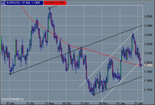 В продолжение опубликованных в недавнем времени комментариев, мы продолжим изучать техническую картину в паре евро/доллар, но теперь уже на графике дневного временного интервала. Сразу стоит обратить внимание на то, что цены в понедельник предпринимали попытку преодоления 100-дневной скользящей средней линии, но ниже ее уровня закрытие не состоялось. Курс пары консолидируется в области текущего значения средней, которая в настоящий момент представляет самую сильную поддержку для евро. При этом нужно констатировать, что восходящий коррекционный канал явно пробит, поскольку закрытие торгов в понедельник явно произошло ниже белой линии канала. Для определения цели роста американской валюты мы воспользуется вилами Эндрюса, которые часто применяем, изучая техническую картину в данной паре, поскольку именно на дневных графиках евро/доллара они, как показывается статистика, крайне эффективны. Несостоявшееся тестирование медианы (средняя черная линия) и пробитие бычьего коррекционного канала сообщают нам цель на 118.25/50, где находится текущее значение нижней линии вил Эндрюса. Однако пока, рассматривая цели роста доллара, необходимо делать поправку на 100-дневную скользящую среднюю. Так как она не преодолена, картина роста американской валюты является незавершенной. Михаил Шульгин ProFinance.Ru - Forex News / Новости Форекс