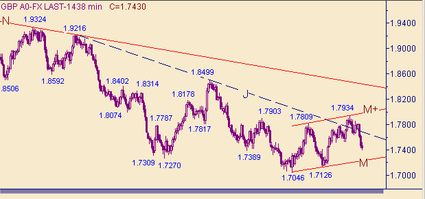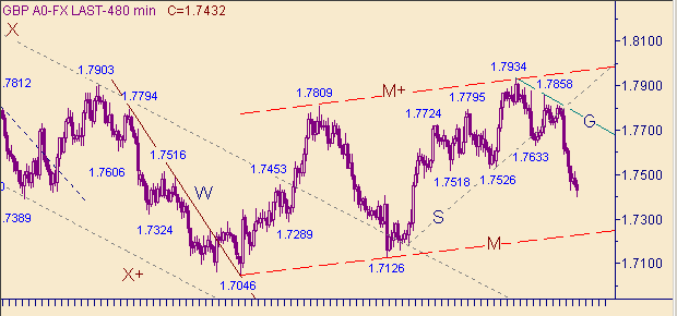 Возможные ситуации, которые удобны для постановки позиции. Первая? В случае выхода курса ниже 1.8370 искать варианты для постановки позиции на продажу с целевой областью 1.7320. Вторая: в случае снижения курса до области вблизи 1.7330 искать варианты для постановки позиции на покупку, используя вспомогательные индикаторы (основной - структуру ценового графика). Третий: в случае выхода курса выше 1.7520 будем этот факт рассматривать как сигнал рынка о своем намерении двигаться до 1.7590-1.7640, что так же предполагает при удобных ситуациях открывать позиции на покупку.