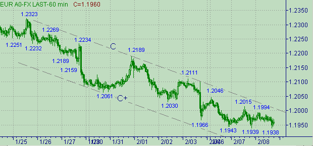 Вот они , последствия недобития технической цели на уровне 1.1930, которые можно наблюдать на графиках, например на рис. 3 - курс евро/доллар формируют локальные донышки пытаясь приблизиться к 1.1930, но никак это не могут сделать. Неспешное изменение курса в интервале 1.1900-1.2000, которое формируется уже второй день выгодно "медведям", так как отпущенное Богом и нами время на формирование коррекционной формации не безгранично и в случае неспособности участниками рынка в рамках коррекции выйти выше 1.2000 будет расценено как сигнал к продолжению down-движения.