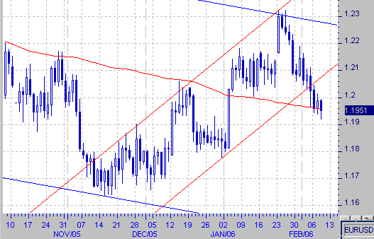 Однако доллар/йене в среду можно отвести роль катализатора движений. "Обратный ход" японской валюты оказывал влияние и на доллар и на евро, через кросс евро/йена. Слабость японской валюты по отношению к упомянутым конкурентам продолжает сигнализировать о том, что глобальный фокус рынка все еще не сместился с дифференциала процентных ставок. Проанализируем поле боевых действий и в евро/долларе. В среду здесь хозяйничали краткосрочные спекулянты. Технический анализ является для них отправной точкой для торговых решений. Вся техническая картина в среду была построена вокруг 100-дневной скользящей средней. Она впервые была протестирована в прошлую пятницу, ограничив минимумы в евро/долларе. Была атакована в понедельник, но закрытие ниже линии не было реализовано. Аналогичное развитие событий было и во вторник. В среду спекулянты не умерили свой пыл и изо всех сил пытаются завершить торговый день ниже скользящей средней.