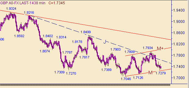 Пока мы увлеченно наблюдали за нисходящим движением с началом от 1.7934(25/01/06) линия M на рис. 2 подобралась близко к графику цены. Текущее положение линии M на рис. 2 соответствует значению курса 1.7256. На рис. 3 нисходящий канал с началом от 1.7934(25/01/06) обозначили линиями F-F+. В этом канале так же имеет место быть проблема противоречия моделей формирования коррекционной формации и нисходящего движения. В модели продолжения нисходящего движения предполагаем, что от вчерашнего максимума, равного 1.7487, формируется очередная (третья по счету) down-ветка в канале F-F+ (см. рис. 3). Это движение на данный момент состоит из почти двух равновеликих нисходящих поддвижений: 1.7487-1.7373 длина 114п.; 1.7414-1.7304 длина 110. Если рассматривать целевые перспективы для down-движения с началом от 1.7487(15/02/06), то целевыми уровнями рассматриваем следующий набор: 1.7260, 1.7190, 1.7120. Из этого списка имеем следующую проблему: с одной стороны критерием формирования этой ветки будет выход курса ниже 1.7270, а с другой первая цель находится на уровне 1.7160.